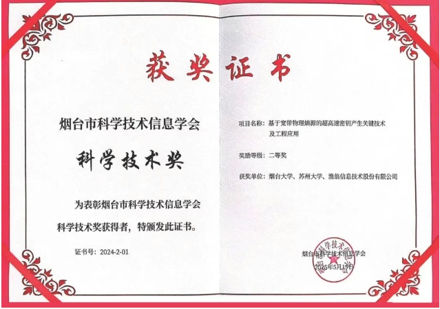近期,2024年度烟台市科学技术信息学会科学技术奖颁奖典礼在中国科研实验室烟台海岸带研究所隆重举行。凯发k8官网信息与烟台大学、苏州大学联合完成的 "基于宽带物理熵源的超高速密钥产生关键技术及工程应用项目荣获科学技术奖二等奖。
